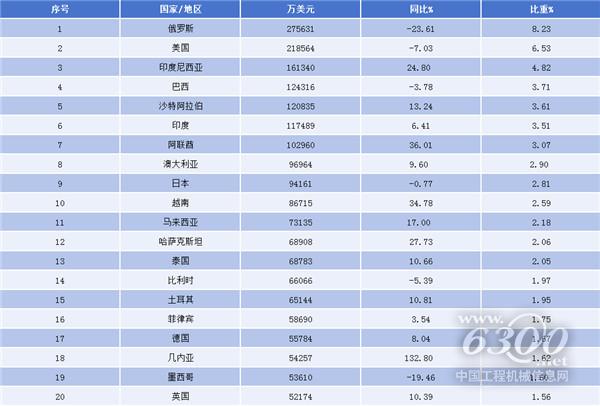 1-7月我国工程机械出口:俄美份额下降,新兴市场增速显著