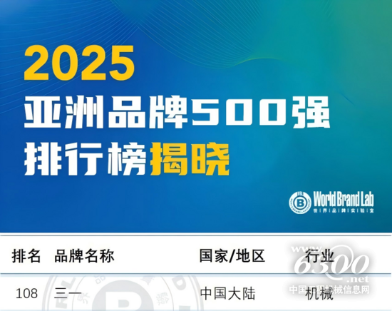 9月24日,世界品牌实验室(World Brand Lab)发布2025年(第二十届)《亚洲品牌500强》年度报告,共有20个国家和地区的超级品牌入选。三一以中国排名54,亚洲排名108的名次成功上榜,并摘得中国工程机械品牌桂冠。