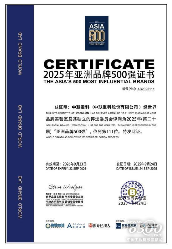 9月24日,世界品牌实验室(World Brand Lab)发布了2025年《亚洲品牌500强》排行榜。中联重科在榜上再度进位,排名提升至第111名,公司品牌活力与潜力持续迸发,彰显出领跑行业的美誉度与影响力,生动诠释了高质量发展的卓越成效。