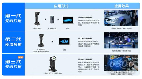 随着高精度三维扫描技术的飞速发展,无线扫描这一应用形式不断深化,经过这些年的发展,先临三维已经历经第一代、第二代直至第三代技术。第一代技术需要配合外置无线模块使用,通过外置的无线模块将数据传输至外置电脑,第二代则在第一代基础上进行升级,将传输模块内嵌至设备内,通过内置的无线模块将数据传输至外置电脑。而第三代技术则是实现了进一步的跨越,其在设备上搭载高性能AI处理器与可视化交互屏,类似在设备内集成了一台电脑,可以在设备内完成数据获取过程中所需的计算功能,配合内置电池供电,一台设备即可完成“三维扫描+输出网格”的完整过程,便携高效。