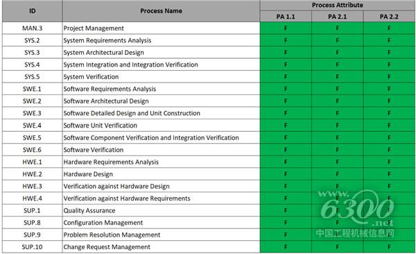 此次徐工以全部满分(F)的卓越表现,成功通过ASPICE 4.0 CL2级的19个过程认证,表明徐工在研发流程规范性、可靠性及风险管控能力等方面已达到国际行业先进水平。