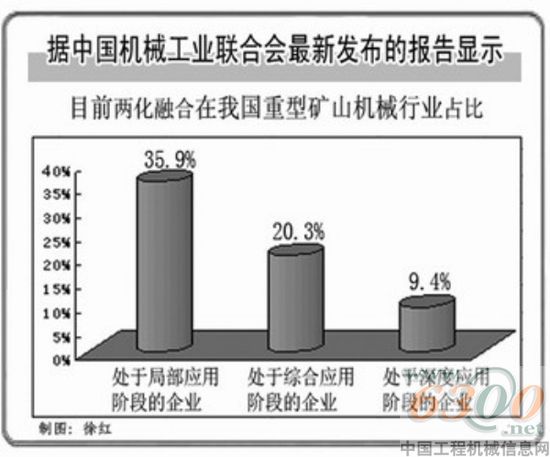 据中国机械工业联合会最新发布的《机械工业(重型机械行业)两化融合发展水平评估报告》显示,目前在我国重型矿山机械行业,有35.9%的企业两化融合处于局部应用阶段,处于综合应用阶段的企业比例占20.3%,处于深度应用阶段的为9.4%。