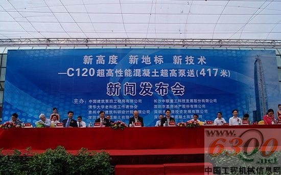 2011年4月10日下午,在深圳京基大厦建设现场,中国建筑第四工程局有限公司(以下简称“中建四局”)携手中联重工科技发展股份有限公司(以下简称“中联重科”)等七家单位,将C120超高性能混凝土泵送至417米的高度。作为全球访问量最大影响力最大的互联网工程机械媒体,中国工程机械信息网(tcsti.cn)与湖南卫视等知名媒体共同见证了该项新世界纪录的诞生,这是继2008年12月16日由中建四局携手中联重科将号称“糯米团子”的C100超高性能混凝土成功泵送至411米的广州西塔顶部后又一项科技创新成果。本次成功完成了C120超高性能混凝土在417米高度的泵送,不仅创造了新的世界纪录,更为今后进一步推动建筑工程中超高性能混凝土的应用铺平了道路。这也标志着全球混凝土机械发展史上又一崭新里程碑的诞生。