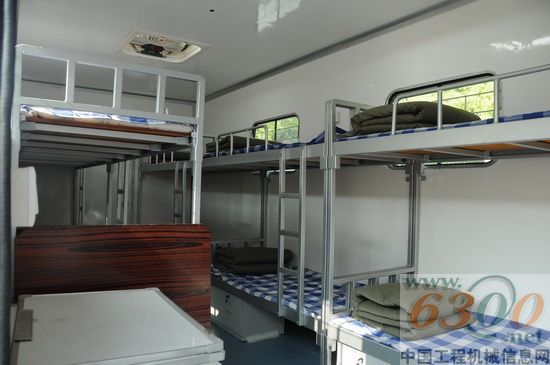 走进房车内部,感觉视线豁然开朗,休息室内白色的墙壁和银灰色的家具相得益彰。最让人惊奇的是,这里可以放下五张高低床,能住十个人。再走近点看看