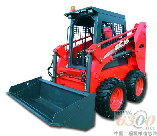 威肯650A滑移装载机是威肯公司(山东光明机器制造有限公司)在原有的滑移装载机系列产品的基础上,充分吸收借鉴了欧洲牧场机械的先进经验,针对于国内牧场养殖业的使用工况、使用效率和应用成本等综合情况,而研制开发的具有高性价比、适合于牧场养殖业多种作业的专用机械。威肯650A型滑移装载机整机小巧;采用进口美国萨奥双联泵;配装国产名牌新柴C490BPG-234发动机(功率40千瓦国II排放);运用了国外先进的液压传动技术,液压油箱、柴油油箱和两侧的链传动箱与车架融为一体,使整体结构更加强健,空间布置更加合理;散热器后置并列式全铝结构散热效果更好;工作系统与行走系统控制方式是左手柄控制左边轮胎行走和动臂升降功能,右手柄控制右边轮胎行走和铲斗的收倒功能,脚踏控制附件装置的动作,符合中国人的身体力学操作习惯;采用手脚联动油门,手油门为固定油门用于任意设定发动机转速,脚油门根据工况需要即时动态调节发动机转速,更好的控制行驶速度与牵引力,驾乘更加安全,行驶更加平稳;配装静压四轮驱动,左右轮胎独立驱动,可以原地360°旋转非常灵活,更小的整机宽度和高度,特别适合狭小牧场养殖空间作业。