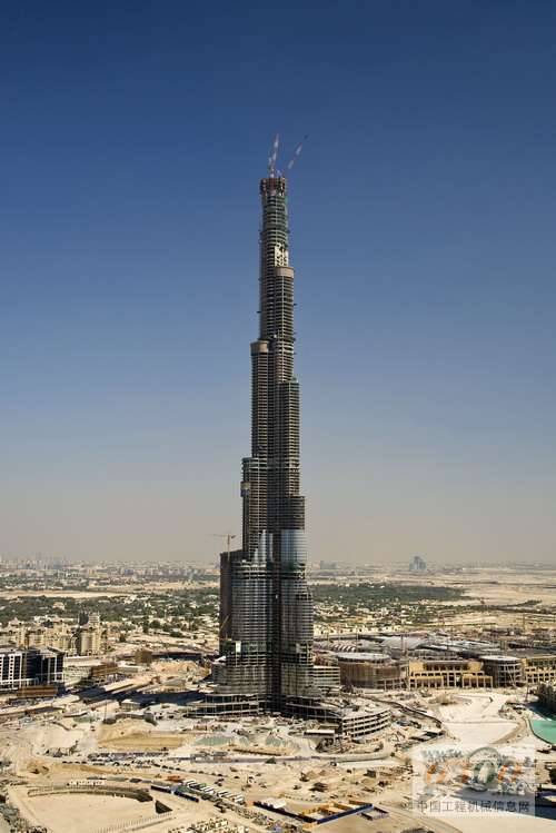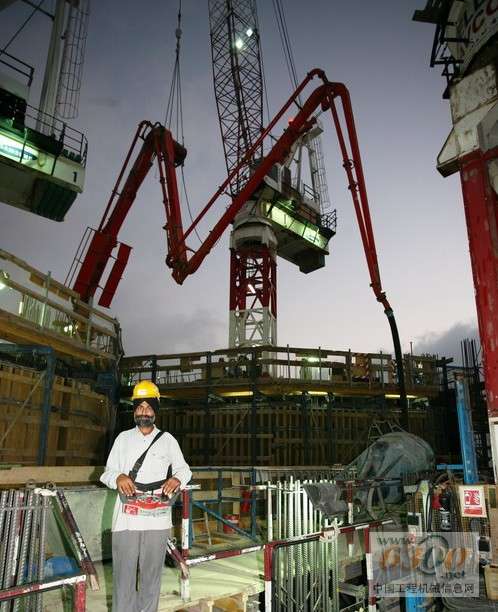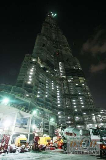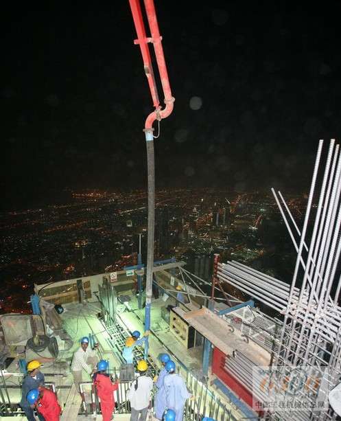 在单独的混凝土工程结束时,会对管道和混凝土泵进行彻底的清洗。为了进行清洗,Unimix在普茨迈斯特公司工程师的建议下,在每台BSA泵机旁安装了所谓的清洗吊架,其包括一个短的水平输送管和大约4米长的竖管,在开放端弯折两次。在即将进行清洗前,BSA泵后的混凝土管由一个液压截止阀关闭,到清洗吊架的连接是通过弯折一个90度角实现的。在吊架下方,一辆空的车载搅拌机等待关闭阀打开,让混凝土由于重力流到车载搅拌罐体中。这样机器操作员就能够清洗BSA 14000泵机了。料斗下的槽会收集残余的混凝土。 由于泵管不是完全空的——在70米长的水平管中还有残余——最后使用海绵球和压缩空气将最后的剩余混凝土从输送管的顶端推出。要进行此操作,混凝土浇注队的两个人拆下固定布料杆顶部的软管,将一个湿的海绵球放入管道,连接一个清洗接合器然后通压缩空气。通过此方法,湿的海绵球在竖管中被往下推,于是混凝土残余被清除。然后以更简单的方法进行彻底的最终清洗,不同的是这次用的是由海绵球、水和第二个海绵球组成的塞子,强行使塞子通过混凝土管。整个过程不超过20分钟。在高层建筑混凝土泵送结束时,管道中大约含有15立方米的混凝土。 现在输送管道中的压强超过了200巴 据中国工程机械信息网(tcsti.cn)获悉,到2007年11月初,阿联酋迪拜塔(Burj Dubai Tower)的混凝土浇注工程已经达到了585米的高度,155层(中央核心、墙壁和楼板)已经完成。使用的BSA 14000 SHP D混凝土泵克服了这个高度上的管道中189到204巴的混凝土压强,具体取决于使用的行程时间(每个活塞行程时间为7到5秒)。实际的输送速率在每小时23到32立方米之间。 在开始超高层泵送前,混凝土泵使用方Unimix和高性能混凝土泵制造商普茨迈斯特公司确认了从全面的测试中得出的结果。通过在混凝土浇注过程中对全面数据和系统信息的记录,普茨迈斯特的工程师为将来的超高层建筑工程积累了丰富的经验。顺便提及的是,财团曾提及并建议在400米左右的高度安装一个中继泵作为预防措施支持超高层混凝土泵送,但该建议没有实施。所有的专家都认为BSA 14000 SHP D固定式混凝土泵可以轻松达到最终611米的泵送高度。由于从586米(第156层)开始钢筋混凝土结构转为钢结构,剩余的楼板混凝土浇注工作将在2008年2月完成。