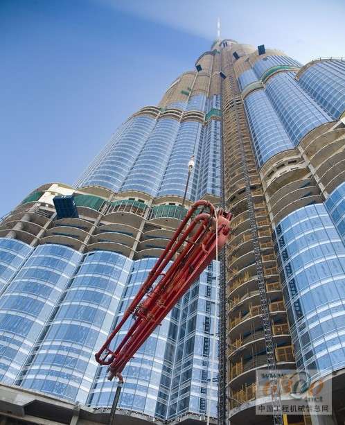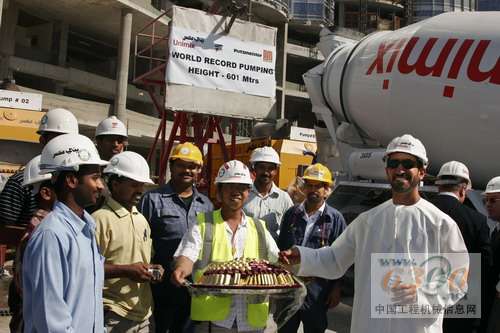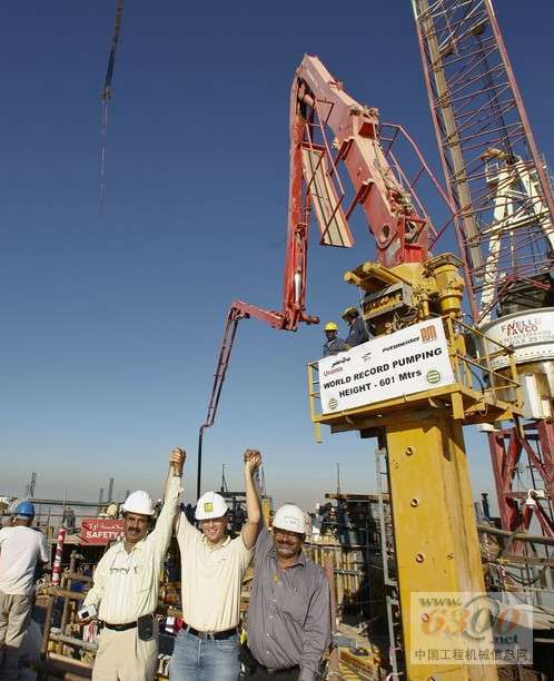 在2007年11月初,阿联酋迪拜塔(Burj Dubai Tower)的普茨迈斯特(Putzmeister)超高压混凝土泵达到了创记录的泵送高度601米。比预想的还要早!在这个高度上,在全世界最壮观的摩天大楼工程中,中央大厦核心的一面墙是在第155层浇灌混凝土的。泵送高度是从固定在建筑结构中竖管的长度和垂直输送管道(包括管形柱和固定式布料杆)的长度计算得出的。实际的混凝土浇注是在585米的高度进行的。高层混凝土泵送还没有结束,但已经不远了。同时,理想的泵送高度已经上移到了611米,而目前混凝土泵工作得非常顺利。