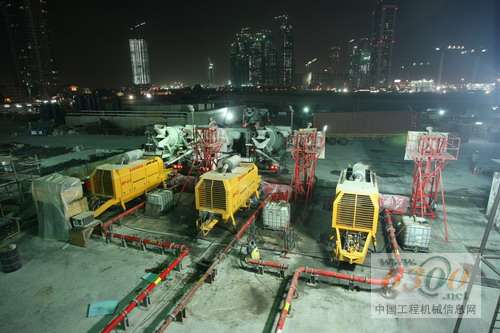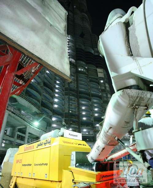 Unimix公司在测试阶段组合了两台普茨迈斯特的BSA 14000 SHP-D超高压泵机和BSA 14000 HP-D“常规”高压混凝土泵机形成一个泵组。混凝土泵离大厦中心的水平距离约70米。超高压混凝土泵是由系列生产的470 kW卡特彼勒(Caterpillar)柴油发动机驱动的。 不同的高度使用的混凝土强度等级 为了尽量降低楼板和承重墙的尺寸,承受随着高度的增加而上升的荷载,这个在迪拜最壮观的超高层建筑的施工现场只使用高强度的混凝土。根据原来的计划,各高度的混凝土强度级别如下: 尽管碎石最大粒径为20毫米的C80A级混凝土原来仅用于95米高度(第26层)以下的结构,但该混凝土被泵送到352米的高度(第100层)(摊铺度为50cm,水灰比0.3)。此高度使用此材料的情况下,有杆腔运行时,当混凝土的排量为30 m3/h,混凝土压强仅为150巴。 加大碎石最大粒径所节省的成本 对不同高度的混凝土等级的设计,一方面,混凝土应能够泵送到300米以上;另一方面,这样明显可以降低成本,因为相对于最大总颗粒尺寸14毫米的混凝土来说,最大颗粒尺寸20毫米的混凝土需要的水泥和细沙要少的多。 尽管规定此混凝土的强度“仅为”80 N/mm2,后期试验常常显示强度大于100 N/mm2。这种高强度混凝土包含20种会影响流动性和凝结性能等的不同外加剂。