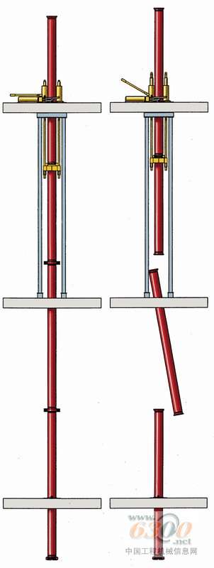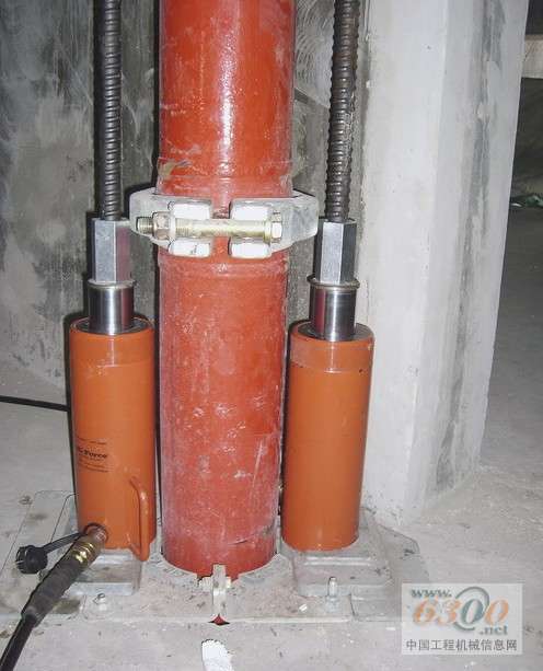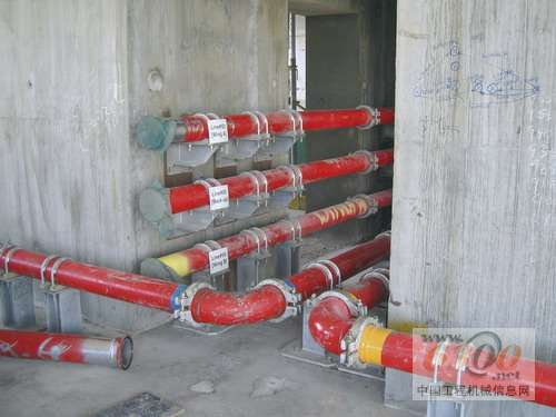 粗管道有优点也有缺点 改变管道的横截面对流量、耐磨性、压强和混凝土在管道中停留的时间(假定每小时的输出相同)有直接影响。与125毫米的输出管道相比,150毫米管道的截面积增大了约44%。这会造成压强下降近25%,磨损会相应下降。 但随着流量下降,混凝土停留在管道中的时间会增加。当设计具体的混凝土规划时必须考虑更长的流动时间。当预期泵送高度为611米时,混凝土在150毫米输送管中停留的时间大约为40分钟。 除了钻孔桩和基础底板的45000立方米混凝土外,还为平台、三个翼楼和塔楼的建设计算了大约26万立方米的混凝土。鉴于大量的混凝土需求,为了尽量减小输送管道的必要变化(在自然摩擦下磨损),普茨迈斯特提供特长寿命的混凝土输送管,管壁厚度11毫米。并通过超声测量定期监测管道的壁厚。 从阿联酋迪拜塔(Burj Dubai Tower)的中心泵组出发的两天大型输送管道首先通过翼楼A。如果翼楼已经浇注混凝土,两条主管道被分为四个部份,每个部份分别连接到固定的普茨迈斯特公司布料杆。此外还提供第五条管道用于备用运行。有些输送管道和布料杆已经拆除。 大型的承重墙支持55吨重的混凝土输送管 要支持垂直输送管的重量(而且在进行混凝土浇注过程中,管道还是满的),每根输送管在转向垂直输送管后必须由大型支座支撑。这些U形的安装支撑被焊在重型钢板上,钢板被浇注在墙中,支撑各竖管的重量。在泵送高度为611米的情况下,管道的重量是巨大的。主管道加上混凝土的重量超过55吨! 每节3米管道由两层楼之间的楼板固定装置固定,在垂直方向上自由移动而不能在水平方向移动。 液压起重设备简化了输送管的更换 普茨迈斯特开发的专用起重设备用于更换个别的输送管。用一该起重设备包括一个特制套管和顶升装置。两个地脚螺栓穿过楼板并受到楼板的支撑。整个上部的管道由液压缸提升,下部的泵管就可以更换了。