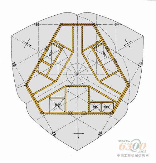 模板的精确定位是通过卫星定位系统完成的。这意味着垂直偏差只有几毫米。在10到12个小时后,模板打开;24个小时后,拆除模板。每3到4天完成一层(大厦核心筒和楼板)。 刚柔并济的塔楼结构 由于阿联酋迪拜塔(Burj Dubai Tower)没有设计主动减震装置,在三座裙楼建筑设计的过程中非常重视空气动力学上的优化。随着大厦的高度的增加,平面上将缩小一些,但从原则上讲,中心是保持一致的。这意味着这座超高层建筑会刚度极高同时又保持相当的弹性。这种施工方法特别适合早上和傍晚风向逆转180度,有时强风风速会超过100公里每小时。对于更强大的风暴(“五十年一遇风暴”),605米高度处的摆动大约计算为40到50厘米。该数据是基于在风洞试验中进行的模拟测试得出的。