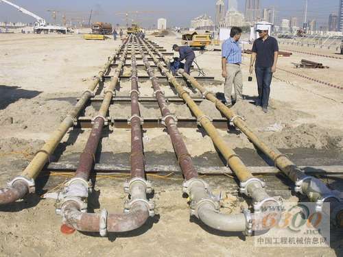 当Unimix公司(阿联酋迪拜塔的混凝土供应商和泵送服务商)决定委托普茨迈斯特(Putzmeister)公司供应和安装拖泵和布料杆系统时需要对合作伙伴的技术水平和可靠性有充分的信任。通过早期的拖泵测试,普茨迈斯特公司已经确定用泵送高度超过600米的混凝土拖泵和混凝土输送管,出口排量为30 m3/h;还了解到,为了稳定,Burj Dubai大厦的顶部将从156层开始使用轻型钢结构,混凝土楼板将浇注到第160层(高度611米)。 在全面的预备测试中模拟超高层建筑的拖泵输送 2005年初,普茨迈斯特在德国总部和迪拜的施工现场作了充分的准备并配备相应的人员,对拖泵和输送管线进行了一系列全面的测试,普茨迈斯特的在当地的代理商German Gulf公司提供了支持。测试的目的是根据混凝土在输送管线中模拟的压力以及混凝土的摩擦并将其转化为超高层建筑的泵送系统。测试使用的拖泵型号为BSA14000 HP-D超高层建筑用拖泵和DN125 ZX输送管线。