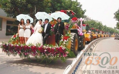 上午10点,在高新区创新路上,10辆黄色装载机整齐地停靠在路边,车身上摆满了鲜花,贴着“喜”字,系着红绣球,一派喜洋洋气氛。半个小时后,身着西服的新郎将身穿婚纱的新娘抱上装载机抓斗,两人手挽手站在装载机抓斗中间,而伴郎伴娘则站在两边。在他们的身后,9辆每辆价值35万元的、并以鲜花装饰的崭新黄色装载机组成了一个“轰隆隆”的迎亲车队,从创新路沿着抚仙路、环山路、东风路在中心城区缓缓移动。