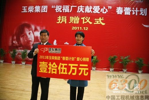 “只要人人都献出一点爱,世界将变成美好的人间”。12月19日,在充满爱的歌声中,2011年玉柴集团“春蕾计划”爱心捐赠仪式在玉柴文化中心举行。玉林市妇联副主席杨巧,教育局副局长蒙绍权,玉柴集团公司党委副书记李天生、郭德明、关敏等领导出席捐赠仪式。玉柴集团工会主席梁萍主持捐赠仪式。玉柴员工、春蕾女童、市级以上相关媒体人员约450人参加活动。