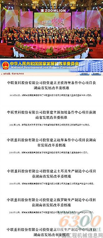 国家发改委2012年2月2日发布:2011年12月,湖南省发展改革委陆续核准了中联重科投资建立印尼、俄罗斯、土耳其和印度四个生产制造中心项目;中联重科投资建立南亚、东亚和欧洲研发试验中心项目;投资建立圣彼得堡、新加坡和迪拜三地的备件中心项目。此外,中联重科投资建立海外销售和服务平台项目也在去年12月获得核准。