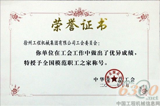 日前,徐州工程机械集团有限公司工会委员会被中华全国总工会授予“全国模范职工之家”称号,这是公司工会继1998年、2000年之后第三次获此殊荣。公司党委常委、工会主席张守航被授予“全国优秀工会工作者” 称号。