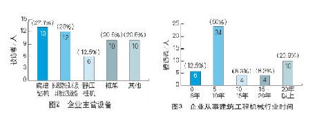 在对企业主营设备的调查中,有13人选择了旋挖钻机,占被调查者总数的27.1%;有12人选择了长螺旋钻孔机及其他钻孔设备,占25%;选择静压桩机的有6人,占总数的12.5%;还各有10人选择了桩架或其他,分别占参与调查人数的20.8%;其他部分主要为零配件企业。在前几年修建青藏铁路时,我们看到的几乎全部是进口的旋挖钻机,而在近两年开工的高速铁路的施工现场,随处可见一排排中国产的旋挖钻机在施工现场出色表演,说明了近几年旋挖钻机这个技术含量较高的产品在中国得到了快速发展,这与此次调查的结果相吻合(图2)。
