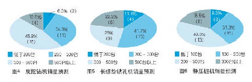 在对静压桩机2007销量的预测中,共有32人参与。其中有13人认为2007年静压桩机的销量在200~300台,占40.6%;有10人认为在100~200台,占31.3%;有6人认为在300台以上,占18.8%;只有3人认为在100台以下(图6)。