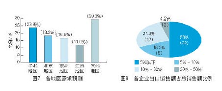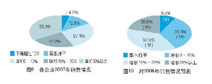 从对2007年各企业销售情况的调查结果来看,参与此项调查的48人,有16人认为企业的增长在30%以上,占到了33.3%,说明了2007年对于桩工机械行业而言,仍然是个黄金年;11人选择了增长在10%~30%,占22.9%;13人选择了增长在0~10%,占27.1%;只有不到5%的企业选择了会下降。可见,行业的整体发展形势良好(图8)。