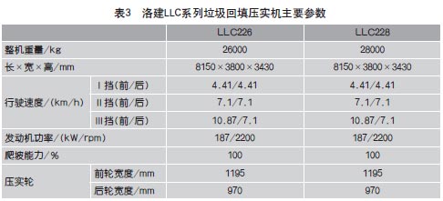 洛建LLC226、228、223、220垃圾回填压实机吸收国外同类设备的先进技术和结构。表3所示。LLC系列垃圾回填压实机选用上柴的CATERPILLAR3306柴油机许可证生产的C6121涡轮增压水冷柴油机(187kW/2200rpm),动力强劲、可靠性高、使用寿命长、使用成本低、综合经济性好、高原适应能力强,达到欧Ⅱ排放标准。设置低温乙醚启动装置使得在-45℃的环境下保证具有优良的启动能力。传动系统采用液力变矩器和动力换挡变速箱,完全能够适应垃圾瞬间变化的恶劣工况,驱动桥内置美国进口的NOSPIN差速锁,转向、提升系统采用美国SAUAR的负荷传感柱塞泵、比例阀及控制手柄、流量放大器、转向器;电器系统选择开关均为法国施耐德公司元件,瑞典OPTIMA电瓶免维护和免保养,即使在-40℃环境下启动时间也仅为0.6s。