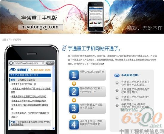 5月15日,宇通重工手机门户网站(m.yutongzg.com)正式上线。该网站的上线标志着宇通重工率先在工程机械领域开启了“智能移动服务”手机门户网站的先河。