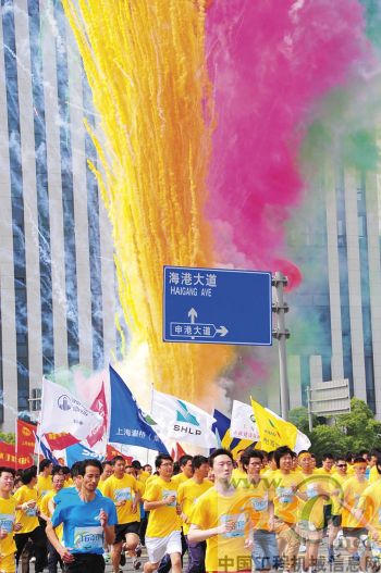 9:30分,随着浦东新区总工会主席姜鸣的一声发令枪响,数十枚礼炮齐发,3000余人的长跑大军犹如一湍激流,奔腾而出,开始了环绕滴水湖畔8.3公里赛程的激烈比拼。