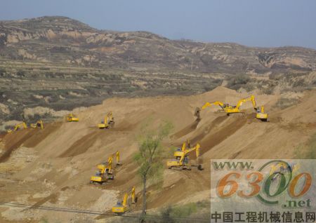在崇山峻岭、丘陵纵横的山西汾阳,20余台徐工挖掘机在大型矿山集群实施覆土作业。远远望去,在高高的矿山山岗上,挖机兄弟俯视矿坑,挥舞巨臂,填平沟壑,场面颇为壮观。徐工设备也以高效率、零故障率赢得了客户的高度赞誉。