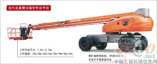 近日,volox(上海)特推出了一款新型高空作业平台---自行走直臂式高空作业平台。其主要性能有:工作平台尺寸:1.83*0.76 m;工作高度:26m/28m/32m/34m/36m/38 m/40 m /42 m转台360度连续回转作业。
