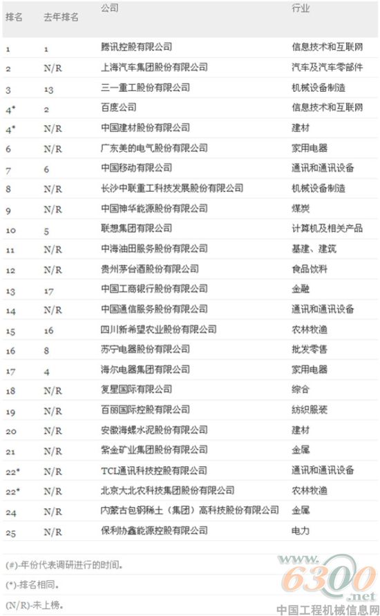 在今年的“最具创新力中国公司”排行榜上,共涌现出了16张新面孔,它们分别是:上海汽车集团股份有限公司(第2位)、中国建材股份有限公司(第4位)、广东美的电气股份有限公司(第6位)、长沙中联重工科技发展股份有限公司(第8位)、中国神华能源股份有限公司(第9位)、中海油田服务股份有限公司(第11位)、贵州茅台酒股份有限公司(第12位)、中国通信服务股份有限公司(第14位)、复星国际有限公司(第18位)、百丽国际控股有限公司(第19位)、安徽海螺水泥股份有限公司(第20位)、紫金矿业集团股份有限公司(第21位)、TCL通讯科技控股有限公司(第22位)、北京大北农科技集团股份有限公司(并列第22位)、内蒙古包钢稀土(集团)高科技股份有限公司(第24位)、保利协鑫能源控股有限公司(第25位)。