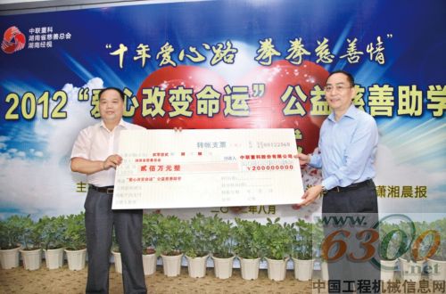在本次活动中,中联重科董事长詹纯新又再次代表企业举牌捐款200万元,省民政厅厅长、省慈善总会常务副会长兼秘书长余长明接受了捐赠。中联重科党委副书记刘驰代表公司接受了省委原副书记、省慈善总会常务副会长谢康生授予中联重科的十周年“突出贡献企业”奖牌。詹纯新董事长发表了《“爱心”企业 十年真情》的感言,他表示:“‘个人价值源于企业,企业价值源于社会’,中联重科始终把企业利益融入国家利益,把企业发展融入社会全面协调发展,并用实际行动诠释了以‘至诚执着之心、仁义博爱之情、自强不息之志’为核心的中联精神。今后,将进一步完善‘爱心助学’工作机制,并注重后期回访与跟踪,把它建设成为中联重科回报社会的一个品牌活动,不断发扬光大。同时也衷心希望受资助的同学们把社会各界的关爱,化为奋发学习的动力,志存高远,自强不息,用优异的成绩回报祖国,回报社会,回报家乡!”