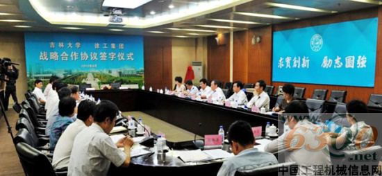 王民董事长在致词中说,此次战略合作协议的签署标志着全国办学规模最大、学科门类最齐全的全国重点综合性大学吉林大学与位居中国工程机械行业第一、世界工程机械行业前列的徐工集团的战略合作进入了一个新的历史阶段,掀开了校企合作史上新的一页。他表示,徐工集团今后要与吉林大学加强合作、扩大合作、长期合作、全面合作、重点合作,全力支持吉林大学发展,同时期待吉林大学对徐工集团给予更多的支持和帮助。他强调,在合作中要充分利用吉大的人才优势、技术资源和创新能力,发挥徐工产品开发及生产制造能力,在工程机械、重型汽车、特种车辆及其核心零部件基础理论研究与前沿技术、新产品开发、关键技术攻关、人才培养、学术交流、资源共享等方面开展全面合作,共同推进工程机械行业的技术进步,产品质量的提高,为创世界品牌,实现吉大成为世界一流大学的目标和徐工成为世界级企业的目标共同奋斗。