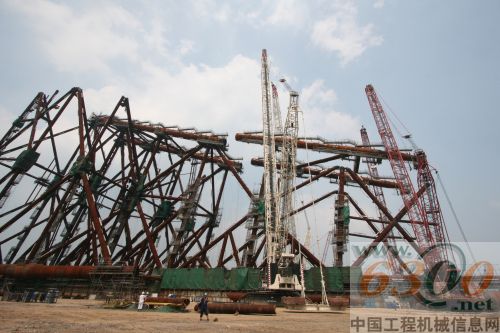 在总指挥的指挥下,四台吊机同时缓慢提升吊钩,使导管架组件离开地面约8m,然后4台吊机同时向前行走10米左右。之后,2台CC6800将吊点提升到距离地面约57m左右、2台CC2500-1将吊点提升到距离地面约41m左右的高度,形成所需要的倾斜角度,然后4台吊机同时向前行走75米左右,直至组件到达安装位置上方。13:40分,4台吊机同时缓慢落钩,组件完成初步就位。