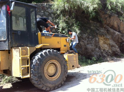 柳工机械充分发挥了重载,动作敏捷,效率高、稳定的优点,在疏通道路的工作中,得到了武警官兵的一致认可。柳工救援队以其高超的技术,充当了灾区工程机械的先锋队,给各品牌机械做检修,保证救灾机械正常运转,柳工救援队更是24小时在灾区的一线,哪里有需要,哪里就有柳工人的身影。在15日中午11时30分,一台在猫猫山工作的某品牌挖掘机瘫痪在道路上,物资车辆无法通过。得悉此情况,武警大队第一时间通知柳工救援队赶往现场协助。救援队员使用柳工CLG855装载机把重达20多吨的某品牌挖机轻松拖到路边,使得车辆得以通行,更协助武警官兵拆卸了该挖机发动机,送去维修。