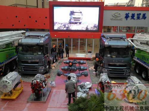 华菱星马的展台面积达1063平米, 参展整车为8台,包括一台华菱底盘56米混凝土泵车和一台五十铃底盘49米混凝土泵车,一台常规动力10方混凝土搅拌车和一台12方LNG混凝土搅拌车,一台32吨随车起重机,一台40吨矿用自卸车,一台6×4右驾星凯马牵引车,一台6×4左驾星凯马牵引车。其中56米混凝土泵车和32吨随车起重机是首次对外展出。这两款产品均是华菱星马去年以来重点打造并于今年正式向市场推出的新产品,代表了其在专用车领域的最新技术成果。目前这两款产品已经完成了各项试验、试制工作,正在加紧向市场推介过程中,其中56米泵车将在参展结束后交付上海城建物资有限公司。