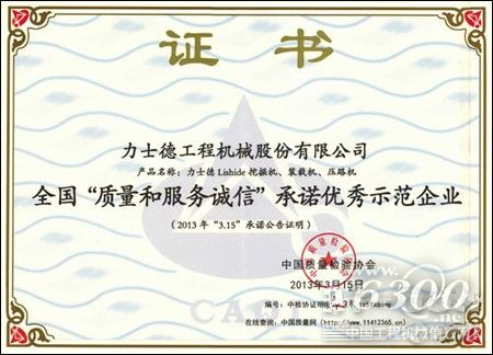 近日,力士德公司在2013年国家质检总局中国质量检验协会举办的“"3.15".国际消费者权益日活动中,经过严格审查,层层筛选,以较高的诚信度和美誉度被中国质量协会评为“全国质量和服务诚信承诺优秀示范企业”,这是我公司连续第二年获此荣誉。