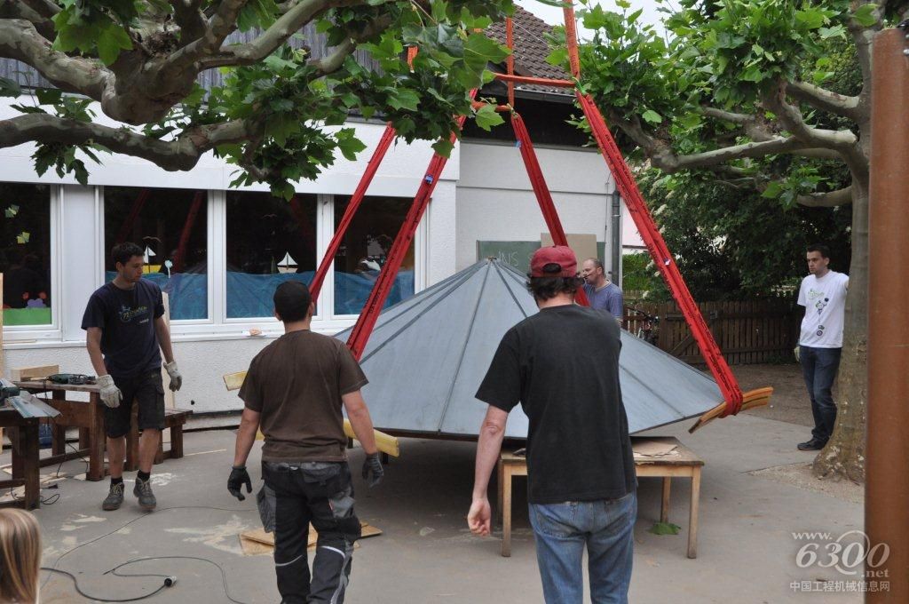 Göttlicher 打完第一个电话后不出几个小时,测试技师 Karl-Heinz Dillinger 便驾驶着一辆Challenger 3160 起重机进入了日托中心所在的尼尔斯泰恩住宅区。随他一起执行此次任务的还有测试工程师 Marc Wiebeck,他主要负责起重作业的项目协调工作。“我们早就知道作业现场的空间十分狭窄,不过我们并不担心这一点,因为我们有应对这种情况的专家——Challenger 3160 起重机。这款起重机的外形超级紧凑,我们几乎是一路畅通无阻地开进了作业现场,而且非常快速地完成了标准配置的架设工作,”他解释道。起重作业对于特雷克斯团队来说早已驾轻就熟:Karl-Heinz Dillinger 操作着起重机提起 300 公斤重的顶部,越过周围的树木,最后将其放在烧烤亭的支柱上:“那些树挡在我面前,我根本没法清楚地看到作业现场的情况,所以在作业时我要完全依靠我队友通过无线电给我指示,”他说道。