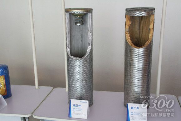 油缸里的两个滤芯分别是中联重科正品滤芯和劣质滤芯。其一看滤材:劣质滤芯的滤材表面发黄,深浅不一,抗震耐压性能差,使用寿命短;中联重科采用的滤材为玻璃纤维,玻璃纤维是一种先进的复合材料,抗震耐压性能好,使用寿命长,工作小时达到500个小时;其二,从滤材与滤材之间的松散度来看,劣质滤芯非常的不紧凑,而中联重科滤材之间紧凑均匀整齐。据服务工程师介绍,中联重科的滤芯比劣质滤芯多用了30%的材料,过滤面积大,过滤效果好;其三,从工艺方面看,劣质滤芯的防护罩仅为0.5毫米,而中联重科滤芯防护罩有1.5毫米。现场用户在经过更直观的感受后发现,劣质滤芯只有1.8kg,而中联重科滤芯有3.5kg,重量是劣质滤芯的2倍。