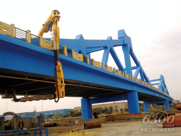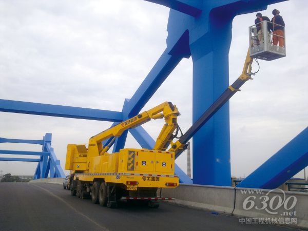 图为一台徐工牌桥检车正在上海境内某高架桥上进行桥梁病害维修、预防性检查及养护作业,由于该设备检测面广,可以迅速到达桥上、下允许的任何位置,即便面对该桥复杂的结构形式也能伸缩灵活、用的得心应手,对于检测不遗留任何死角,再加上操作简便,大大提高了工作效率,受到现场操作人员的一致好评。