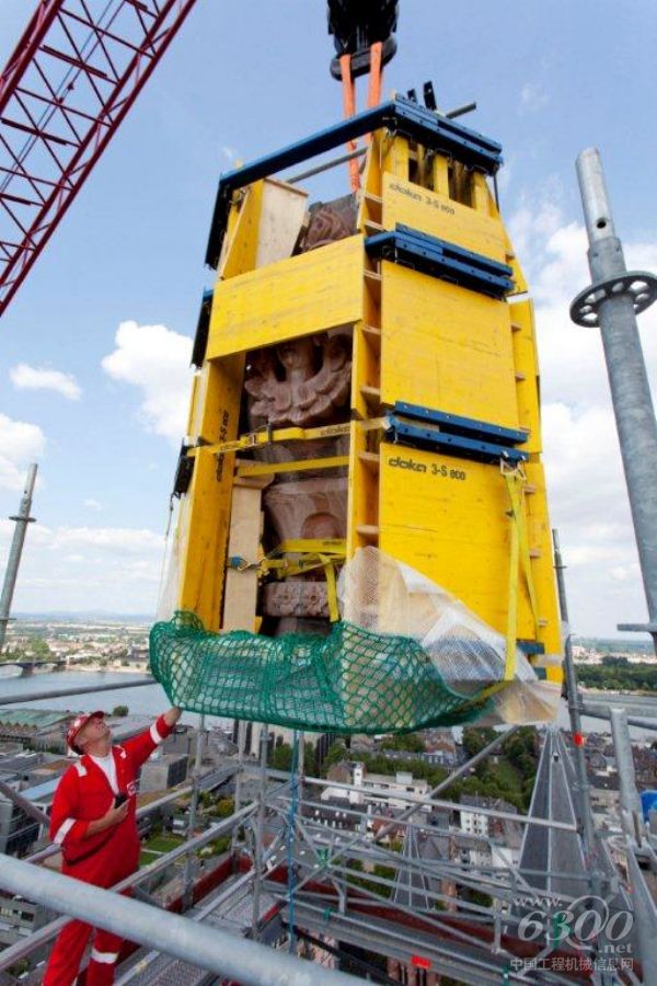 通过这种安全和平稳的方式,这件可以追溯到17世纪的石雕被连接在了起重机的吊钩上。通过塔式脚手架上工作人员发出的无线电传送的指令,起重机司机Waldemar Michel慢慢增加设备的起重能力,待增加到合适的起重力后,石雕轻盈且缓缓地从塔顶下降。伴着栅栏后观众的掌声,石雕在片刻后便顺利放置在教堂的广场上。最重的负载是新尖顶和旧尖顶的下半段,要求大型起重机在60多米的起吊半径下来完成约16吨重的吊装工作。