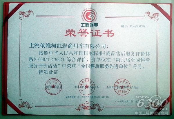 2013年9月8日,备受关注的“第六届全国售后服务评价活动发布会暨服务创造新价值论坛”在北京举行。在颁奖典礼上,上汽依维柯红岩商用车有限公司(以下简称“上汽依维柯红岩”)荣获“全国售后服务先进单位”称号。
