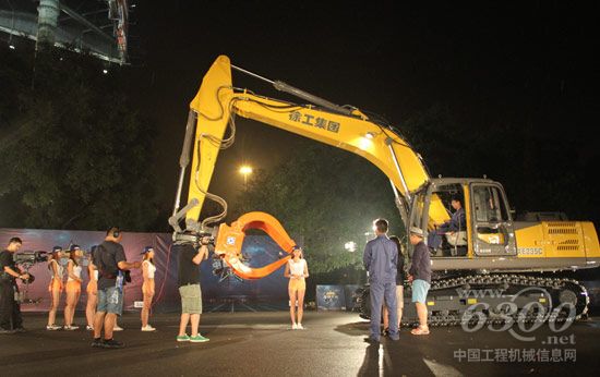 天高气爽的金秋九月,在北京丰台区“吉尼斯中国之夜”的备战现场,金色的徐工XE235C挖掘机在两名徐工员工的轮流操作下,将戴在模特头上的蓝色鸭舌帽一一摘掉,动作干脆利索一气呵成,引发了围观人员的阵阵惊呼。来自徐工挖掘机机械事业部的两位员工吴恒、高芝栋正在进行紧张的拍摄现场彩排,他们即将向“挖掘机一分钟内摘帽子数量”世界吉尼斯记录发起挑战。
