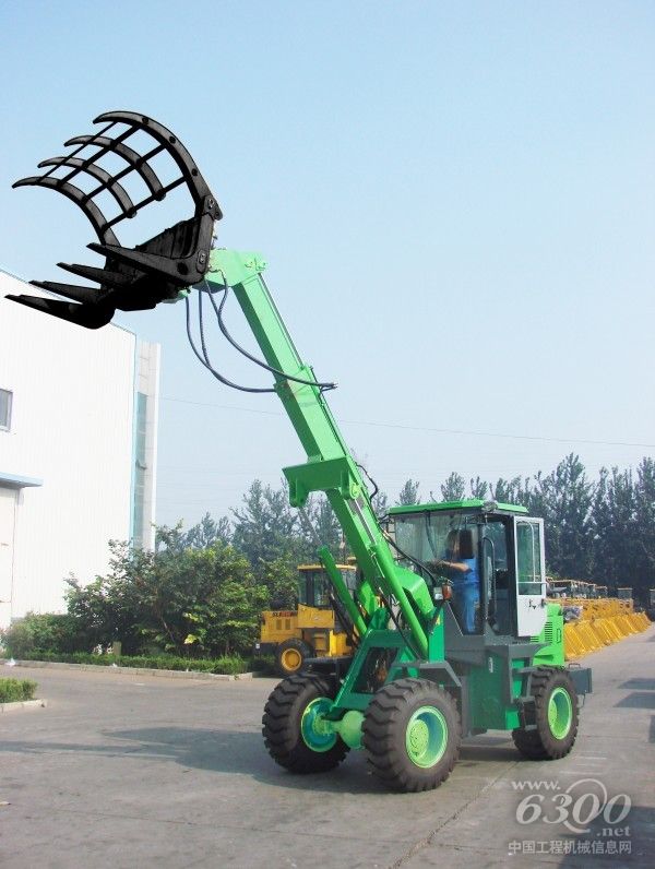 新型装载机的机身为绿色,外形美观,最大的特点便是可以自由伸缩的动臂系统,附带多种辅具能实现多种作业,可满足多种工况需求。
