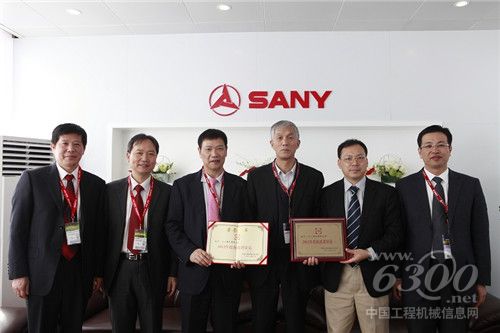 中国工程机械工业协会会长祁俊(左四)向三一集团颁发2012年挖掘机销量第一荣誉证书