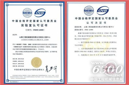 经中国合格评定国家认可委员会CNAS的审核,山推股份公司理化计量中心管理体系、仪器设备、设施和环境、技术人员素质、检测能力等方面均达到国际认可标准,顺利通过国家实验室资格认可,成为工程机械行业为数不多的CNAS认可实验室之一(认可证书号CNAS L6480)。