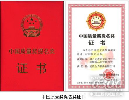 中国质量奖是我国质量领域的最高荣誉,中国质量奖评选着重于“评管理”、“评理念”,开展周期为两年一次,设立中国质量奖和中国质量奖提名奖。按照《中国质量奖评审规则》的规定,经形式审查、专家材料评审、中国质量奖评选委员会投票表决等环节的严格评审,最终安徽合力荣获首届中国质量奖提名奖。