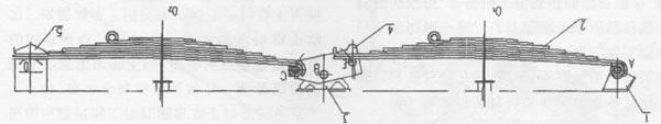 如图,O1为一桥中心,O2为二桥中心,序1为前支架,其与车架焊接在一起,序2为钢板弹簧,与三轴底盘板簧通用,通过弹簧销在A点与前支架铰接,板簧另一端与序4平衡梁在E点滑动联接,序3为中间支架,与车架焊接为一体,同时在B点与平衡梁铰接,二桥板簧(与一桥板簧通用)在C点通过弹簧销与平衡梁铰接,二桥板簧另一端与序5后支架在D点滑动联接。车辆在行驶过程中,平衡梁两端C点和E点所受垂直载荷相等,以保证平衡梁的动态平衡,根据力学公式,可计算得出一、二桥载荷基本相等。同时,平衡梁为保持始终处于动平衡状态,不停的绕B点摆动,这时,一桥板簧连同一桥一起绕A点摆动,二桥板簧连同二桥一起近似绕D点摆动,这个摆动会使桥的后倾角发生变化,导致影响转向性能。设计时,为兼顾转向性能不致受影响或受影响很小,在中间支架上有两个L形筋板,这两个筋板既起加强中间支架的作用,又起到对平衡梁的限位作用,以保证一、二桥的后倾角在0°~3°范围内变化,在中间位置时,桥的后倾角为1?5°(图中位置)。从以上分析得出,该前悬架型式是合理可靠的。