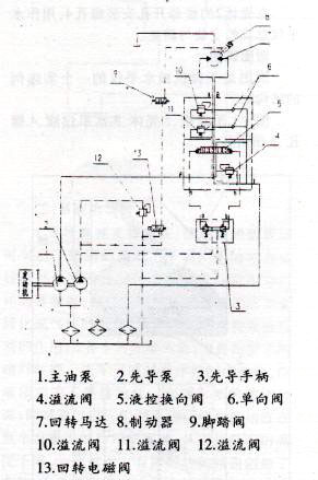 工作时首先打开回转电磁阀13,由先导泵提供稳定的压力油源,保证回转制动器8开启。然后,通过推动或拉动先导手柄3,使先导压力油平稳的开启液控换向阀5的阀芯,主泵的压力油流经液控换向阀。驱动回转马达7的旋转,完成回转过程。当不工作时,先导手柄3中位,液控换向阀5阀芯靠弹簧恢复处于中位,主油路中油液便低压从P口通过主阀流回到油箱。该系统具有以下特点: