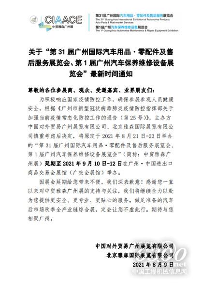 8月9日消息,“第31届广州国际汽车用品·零配件及售后服务展览会、第1届广州汽车保养维修设备展览会”(简称:中贸雅森广州展)”的主办方中国对外贸易广州展览有限公司和北京雅森国际展览有限公司联合在官方渠道宣布:将原定于2021年8月21日-23日举办的展会延期至2021年9月10日-12日在广州·中国进出口商品交易会展馆(广交会展馆)举办。