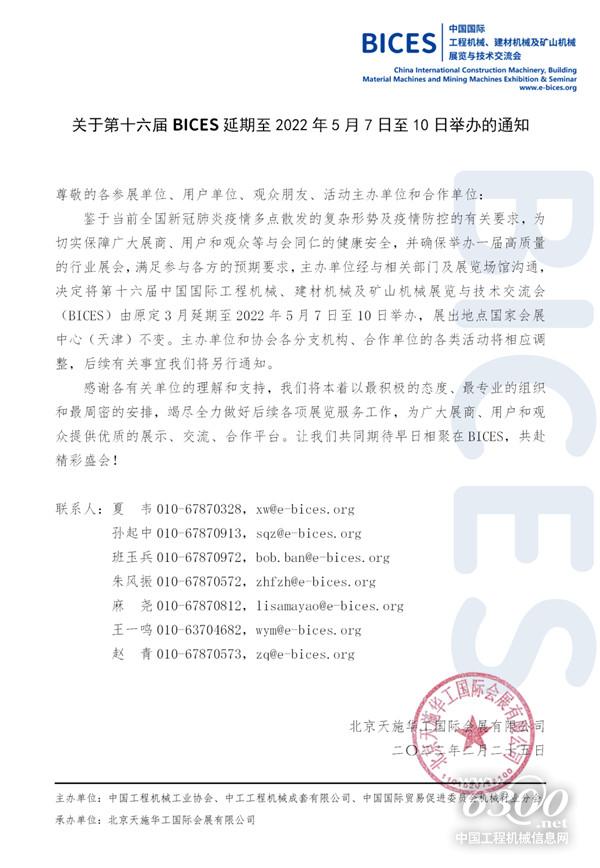 关于第十六届BICES延期至2022年5月7日至10日举办的通知