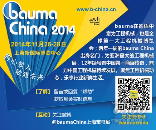 bauma China 2014将于今年11月25-28日登陆上海新国际博览中心,为促进展商及观众的互动,我们在6月份特推出“我是展商”征文活动,符合要求的征文将会定期发布,为展商提供更多的宣传机会,同时,也为观众提前锁定拜访展商名录提供参考。请大家一起来扩散!