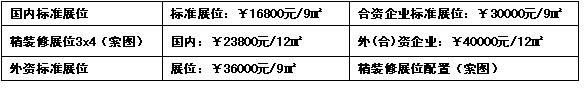 1、标准展位9m²(3m×3m);配置:展出场地、三面展板(高2.5m)、一块中英文楣板 、一 张洽谈桌、二把椅子、地毯、220V电源插座一个、二支射灯。 (注:双开口展位加收20%)